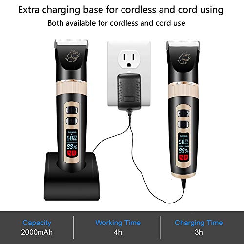 ☞【Cordless and Cord Using are Available】- Wireless rechargeable pet clipper has an anti-skid handle and high-quality rechargeable 2000mAh Li-ion battery, can be charged in 3hours and lasts for 4 hours.You’ll also use it with cord for extremely long time clipping.Note: The oil for blade is NOT included in the package as a result of shipping restriction.