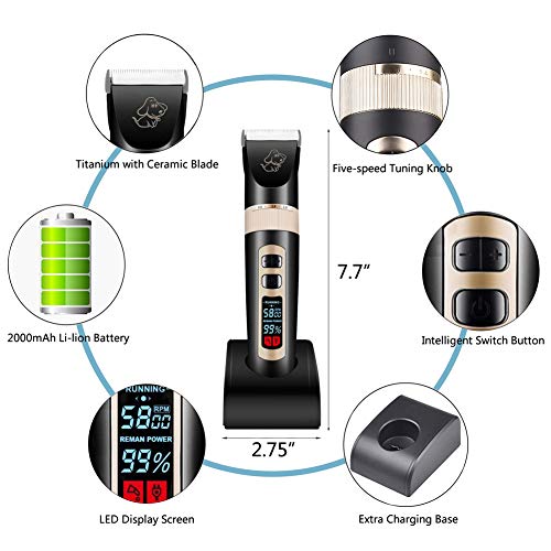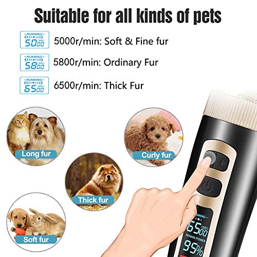 ☞【LED Screen Smart Indication】- This pro dog clipper is designed with Led screen to remind the power use, the speed it is running, the time to add oil and clean the blade. This function can help users to better regulate hair clipping process. When you use the clipper for enough long time, the clipper will remind you to oil the blade to better protect the blade for long term use. When the blade get stuck by hair, the clipper will intelligently remind you to clean it.