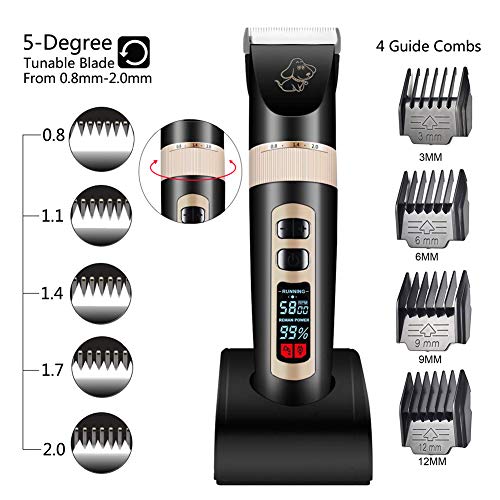 ☞【Adjustable and detachable cut-blade】- Sharp and Durable titanium blade combining with the ceramic movable blade provide efficient cutting performance. This pet hair clipper will not do any harm the pet’s skin and stuck the pet’s hair. The Ceramic movable blade produces less heat after long time’s use, which prevents scalding your lovely pets.five sizes of adjustable blades of 0.8mm/1.1mm/1.4mm/1.7mm/2mm for precise adjustment on hair length,give your pet the image that belongs to it.