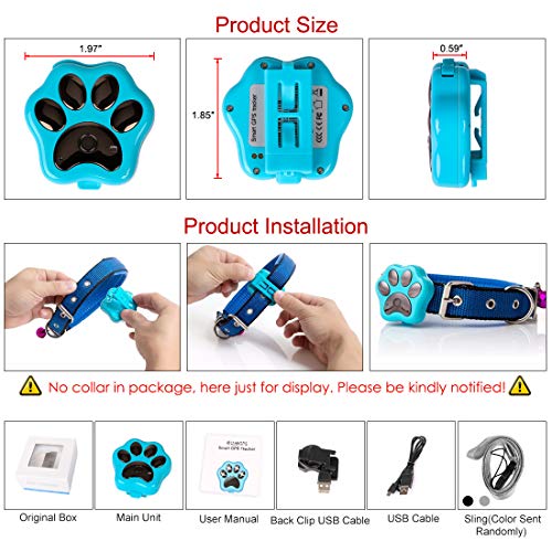 SMALL, LIGHT, SPLASH PROOF — Mini Tracker specially for Pet. Weighing just 45 grams and safe by a durable case, GOLOPHY Pet Dog GPS Tracker is small and easy to attach to any pet collar. IP66 waterproof design, dust-proof, shockproof, no wish to worry about rainy days.