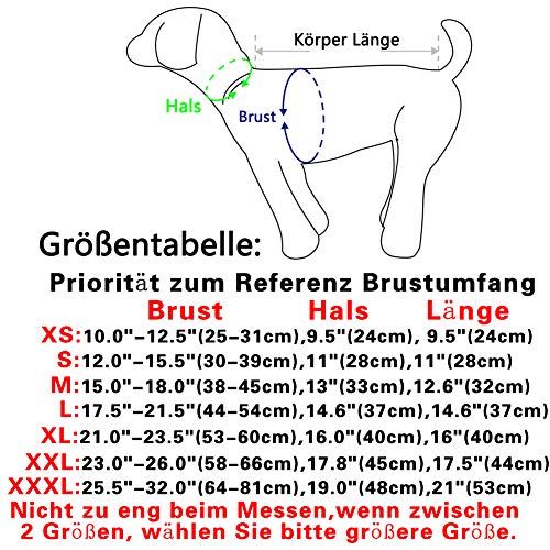 Size XS:Chest11.0″-12.five”(28-31cm),Neck9.five”(24cm),Lenth9.five”(24cm),NOTE:Please measure your dog before ordered,priority to reference CHEST girth(Do not too tight when measuring).