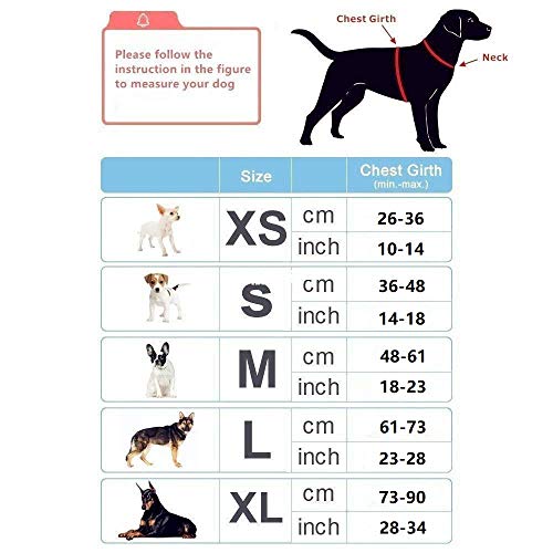 Quite a lot of Size – Measure around the widest part of dog chest. If between size, please choose the larger size. Be sure to set aside 0.7-1.1 inches(2-3cm). S– Chest Girth: 14in – 18in(36-48cm); M– Chest Girth: 18in – 23in(48-61cm); L– Chest Girth: 23in – 28in(61-73cm); XL– Chest Girth: 28in – 34in(73-90cm)