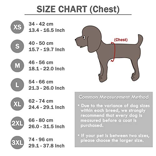 VARIOUS SIZES – Measure your dog’s chest girth (very important) and back length (for reference) by following sizing guide to select a right sized pet coat. Before taking any measurements, please ensure your dog is standing still and upright, looking forward and on all fours.