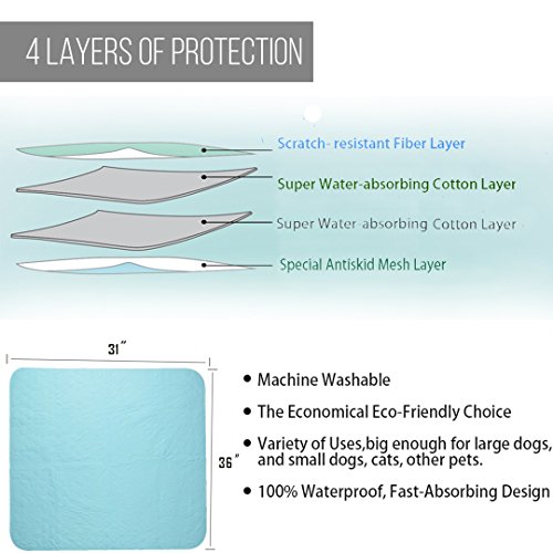 ABSORBENT AND QUICK-DRYING: 4-layer absorbent and leak-proof quick-drying function.Highly absorbent top layer non-woven fabric is resistant to scratches and tears.100% Waterproof, Non-slid bottom layer PU& mesh prevent leaks from escaping onto floors or furniture to offer floors and carpets with maximum moisture protection