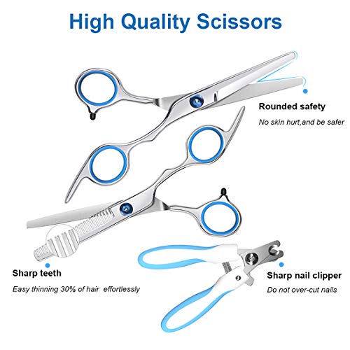 【Protected & Sharp Blade】Cat/Dog clipper blades with Titanium acute-angle blade combining with the ceramic movable blade for smooth cutting.The fine-tuning knob offers five length (0.8-2mm)for precise adjustment on hair length.And the dog grooming scissors & nail clippers to make pet grooming easier.