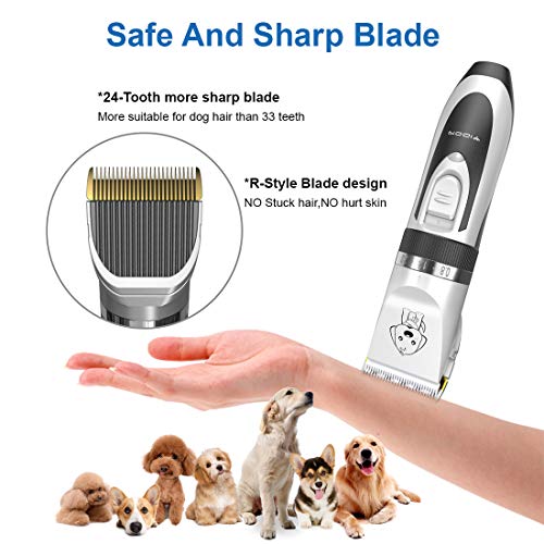 【Super Quiet】Dog clippers low noise with precision motor,low vibration.It uses Q-SUS design,the noise is below 60 db, to help pet feel at ease,not afraid haircut any further.Powerful motor of professional dog clippers, not to clamp hair and hurt pet.